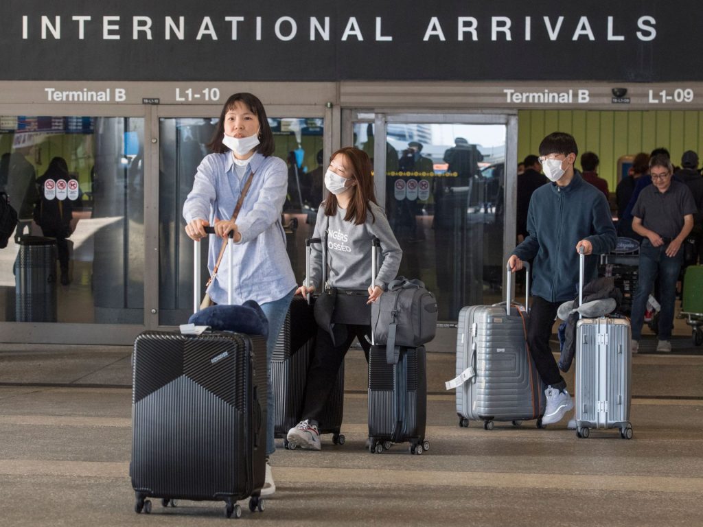 Passengers wear face masks to protect against the spread of the Coronavirus as they arrive on a flight from Asia, at Los Angeles International Airport, California, on February 2, 2020. – The US has declared a public health emergency and starting today February 2, is temporarily banning the entry of foreign nationals who had traveled to China over the past two weeks to contain the spread of a deadly new virus. In addition, any US citizen returning from Hubei, the province at the center of the outbreak, will be subject to a 14-day mandatory quarantine in a facility. (Photo by Mark RALSTON / AFP) (Photo by MARK RALSTON/AFP via Getty Images)