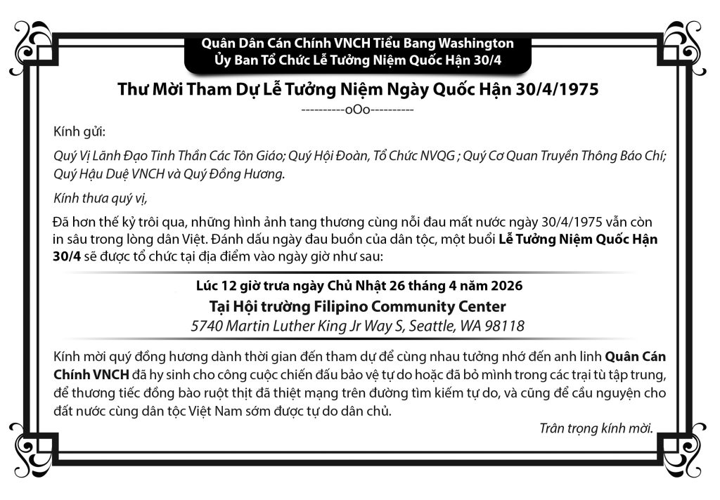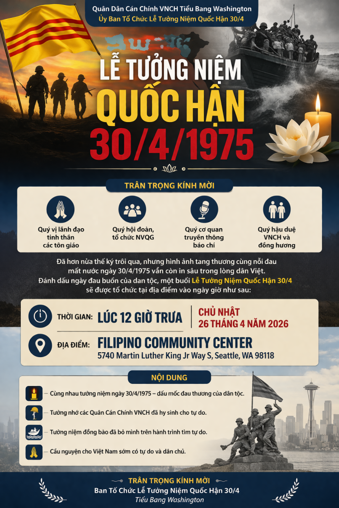 Buổi họp đã diễn ra với nhiều ý kiến đóng góp hữu ích, và sau khi bàn thảo các thành viên tham dự đã đồng thuận quyết định tổ chức lễ tưởng niệm Quốc Hận 30 tháng 4 lần thứ 51 tại hội trường Filipino Community Center 5740 Martin Luther King Jr Way S, Seattle, WA 98118. Thời gian từ 12 giờ trưa ngày Chủ Nhật 26 tháng 4, 2026. Với thành phần BTC: Trưởng ban Châu Nguyễn, Phó trưởng ban cựu SVSQ TĐ Phạm Quốc Nam, phụ trách văn nghệ Nguyễn Huy…cùng với sự tiếp tay của quý cựu quân,cán, chính VNCH